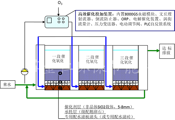通過(guò)高效催化投加裝置后的臭氧和水的混合液,由增效噴嘴進(jìn)入專(zhuān)業(yè)設(shè)計(jì)的氣水分配濾磚均勻進(jìn)入貴重金屬的催化劑層,催化劑表面具有外墻電位,有效的激發(fā)產(chǎn)生羥基自由基,羥基自有基的氧化還原電位為E0=2.8ev,在如此高的氧化電位的作用下大部分難降解的有機(jī)物發(fā)生斷鏈反應(yīng)形成短鏈的有機(jī)物或直接被氧化至CO2和H2O,最終出水可達(dá)設(shè)計(jì)排放標(biāo)準(zhǔn)。永磁高級(jí)催化氧化系統(tǒng)的工藝流程如下所示: